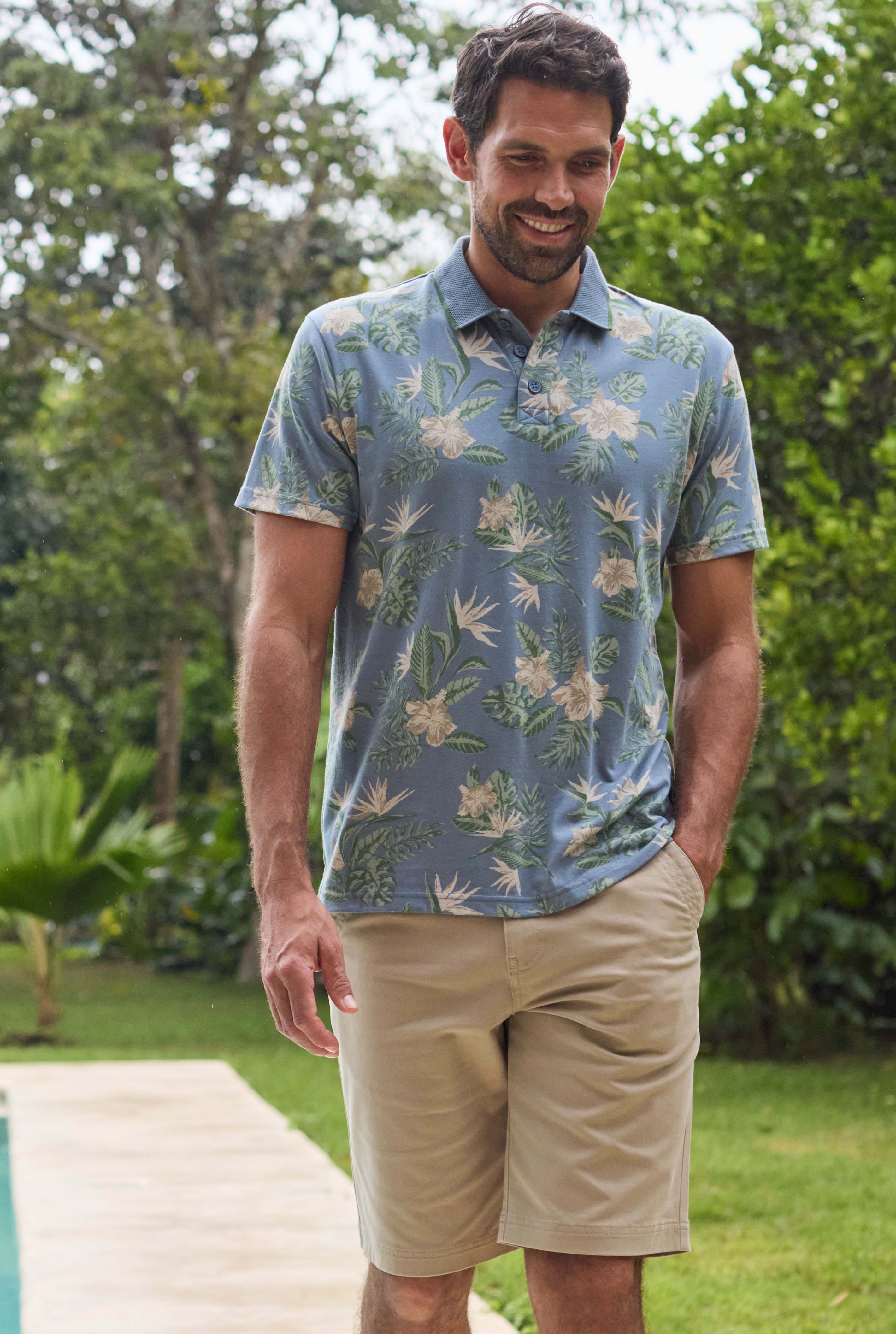 Our Jarat Printed Jersey Polo is sure to make a statement this season. Typical polo shape, made from comfortable cotton, completed with an all over print, and a textured, tipped, collar. Ideal for Summer BBQs.