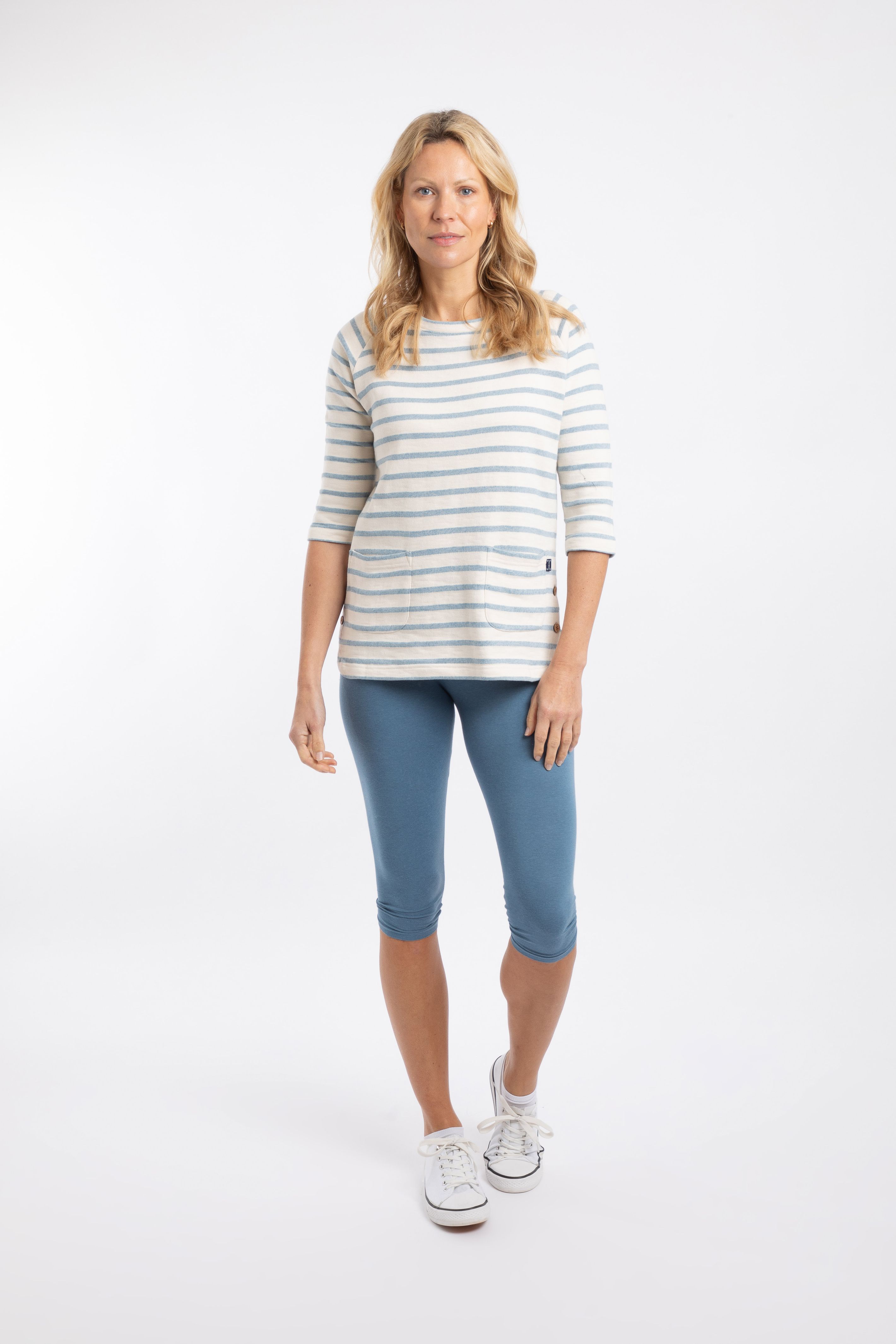 Ideal for transitional weather, the Ives Loopback Stripe Tunic Top is a little heavier than a T-Shirt, but lighter than a jumper. We love the curved, long-line hem with fun, button details on the sides. The woven stripe has a loopback texture on the inside, and we have added a couple of front patch pockets, because everything is better with pockets.
