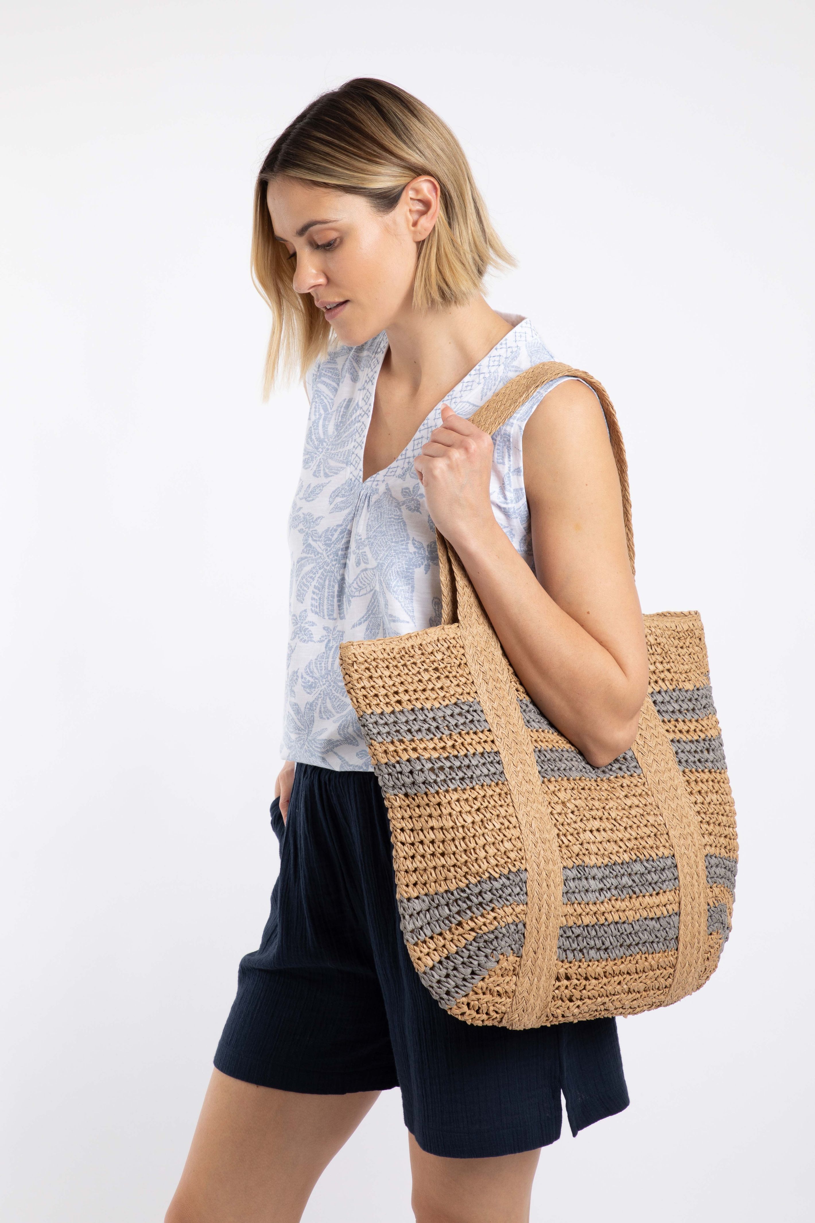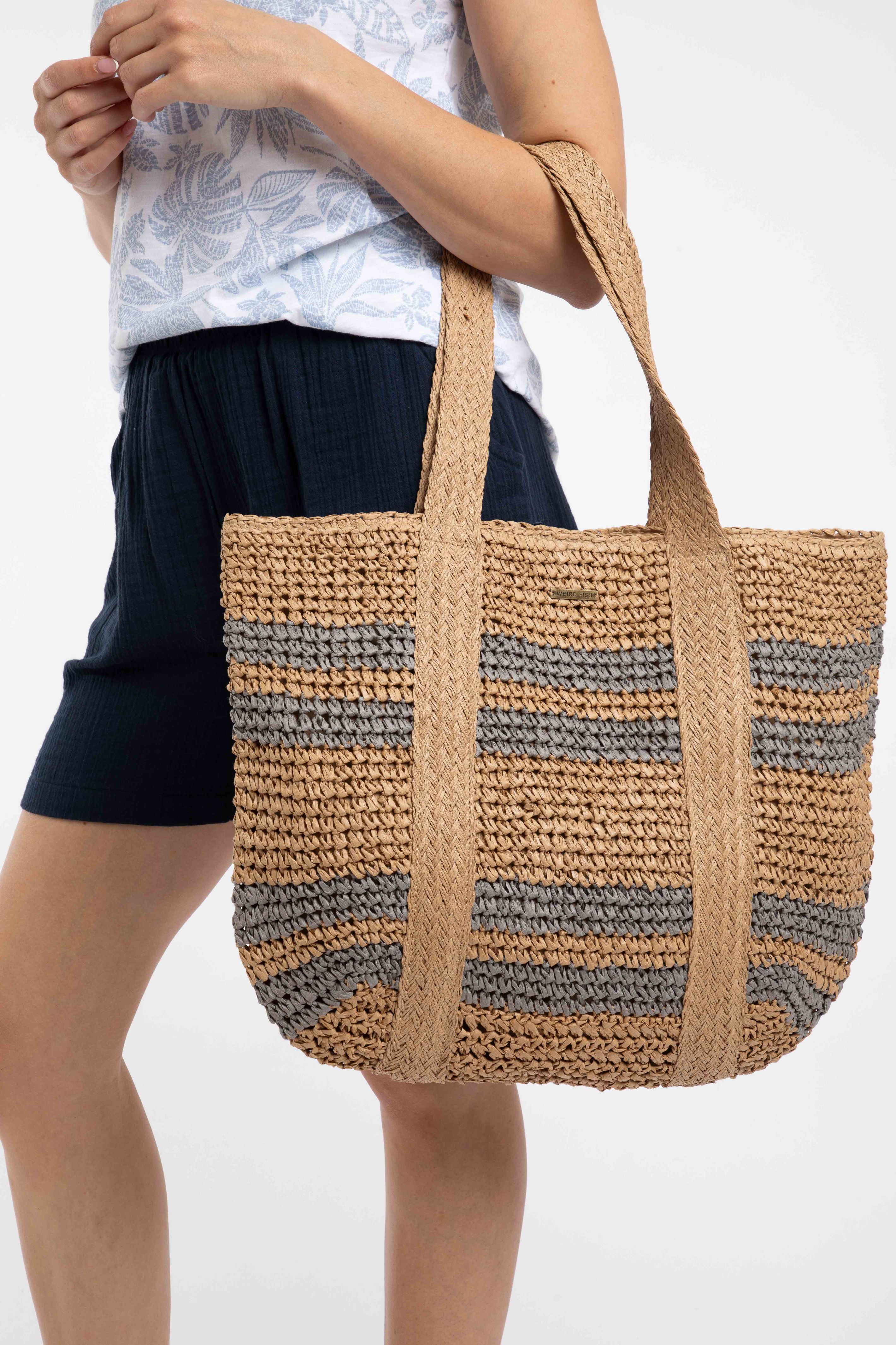 The Elver Raffia Tote Bag would make the perfect beach bag. The large size can easily fit a beach towel and any other sunshine essentials. The main compartment has a popper fastening, with a small slip pocket inside, ideal for a phone. The natural colours look great with any outfit, why not team with a matching hat?!