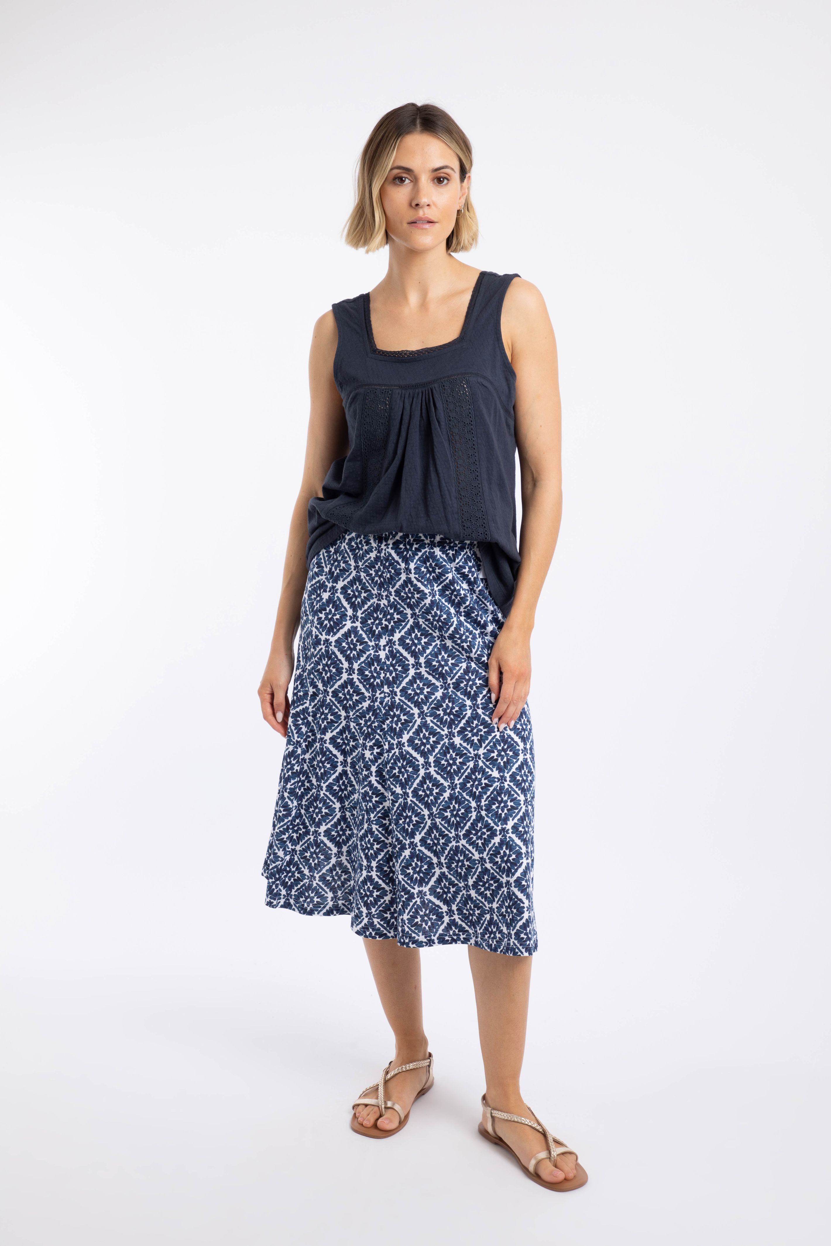 With the love for our Malmo jersey skirt, we bring you the Romaro Printed Jersey Midi Skirt. The godet panels help give the skirt flow and shape, while the jersey, stretch fabric makes it super comfortable, so it is ideal for a smart casual outfit. Team with a fine knit for transitional weather, and swap out for a vest or T-Shirt when the sun begins to shine.
