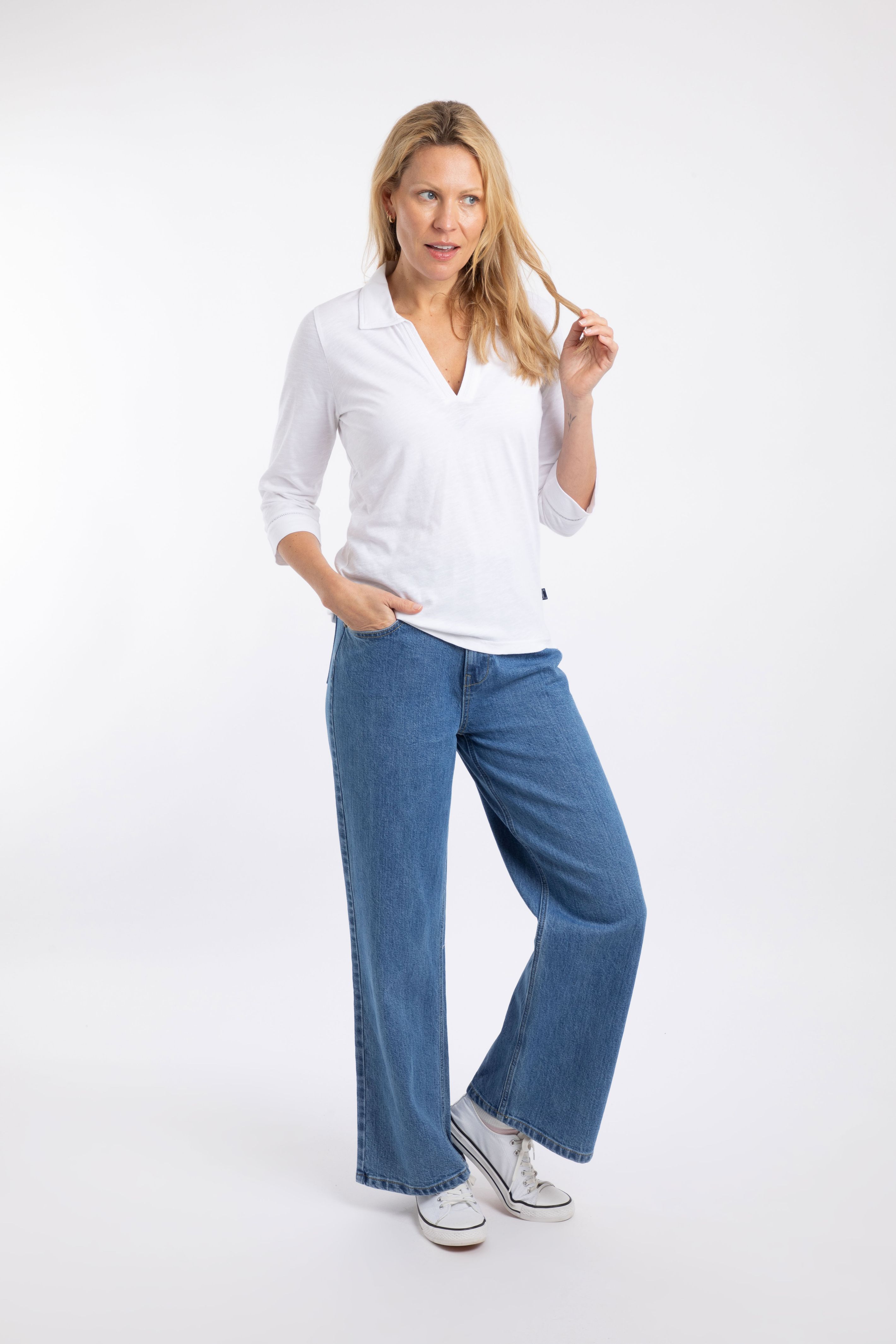 The Annare 3/4 Sleeve Jersey Trophy Neck Top is a soft and comfortable T-Shirt, with the unusual neckline, elevating this to be more than your average style, with a slub texture and a slight drop-tail back.