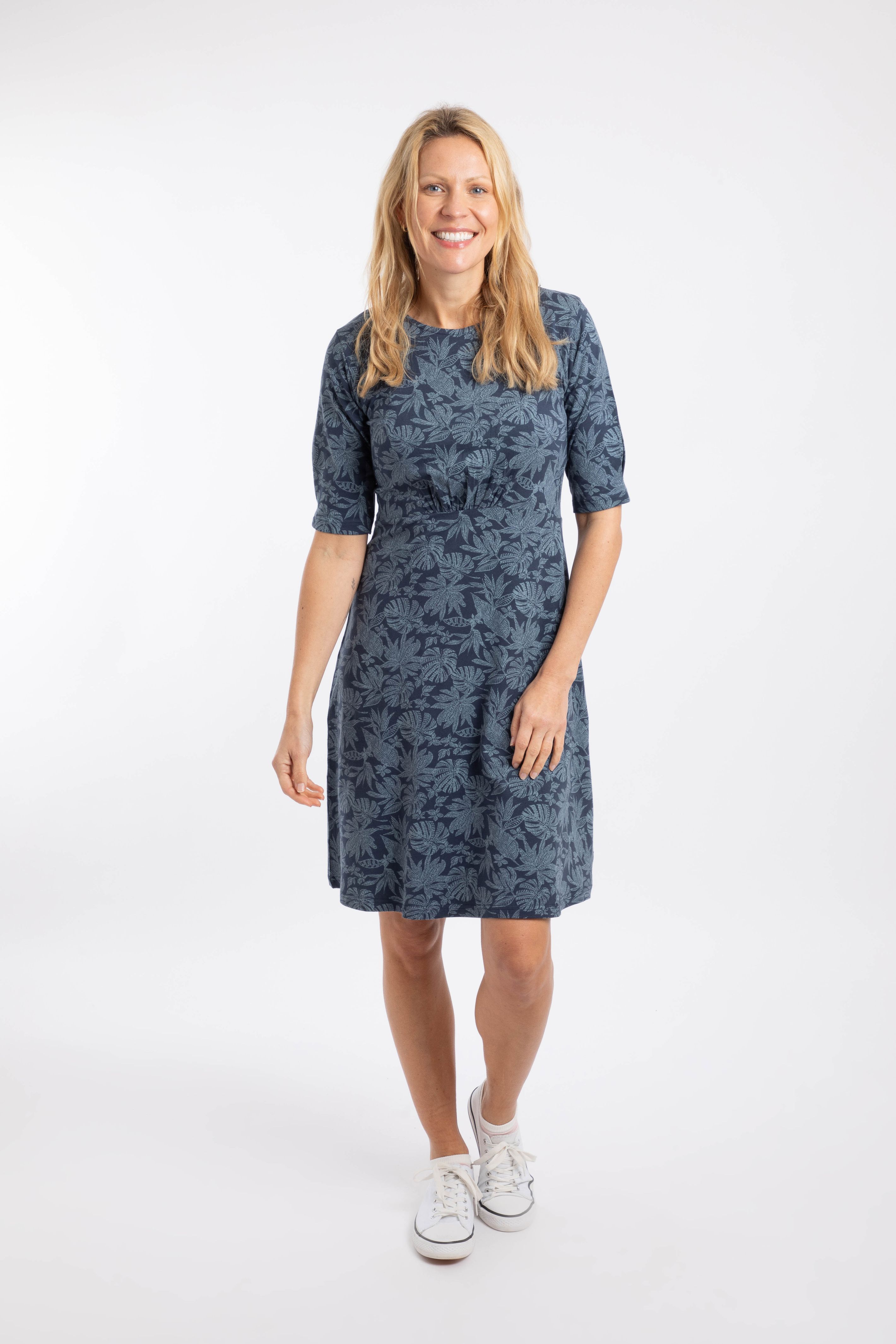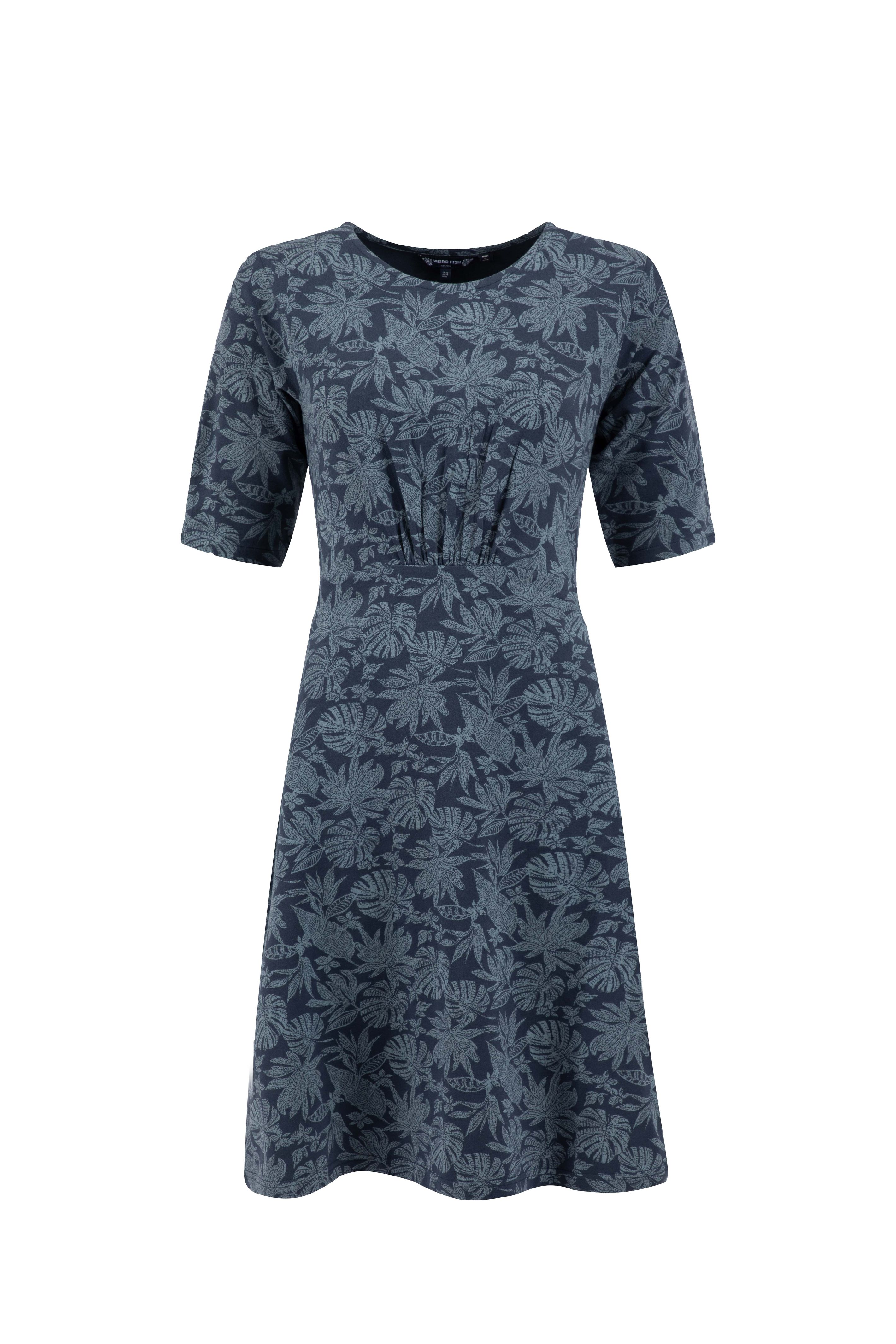 We are known for our easy to wear, no fastening, pull on jersey dresses at Weird Fish, and this season we are welcoming a new shape in the Cassandra jersey swing dress. It has a gathered detail empire line for a really flattering fit, that falls away into an A-line for a fun and flirty swing dress shape. We love the longer 3/4 sleeves, quirky print, and super-soft jersey fabric with a little elastane for add comfort and stretch.