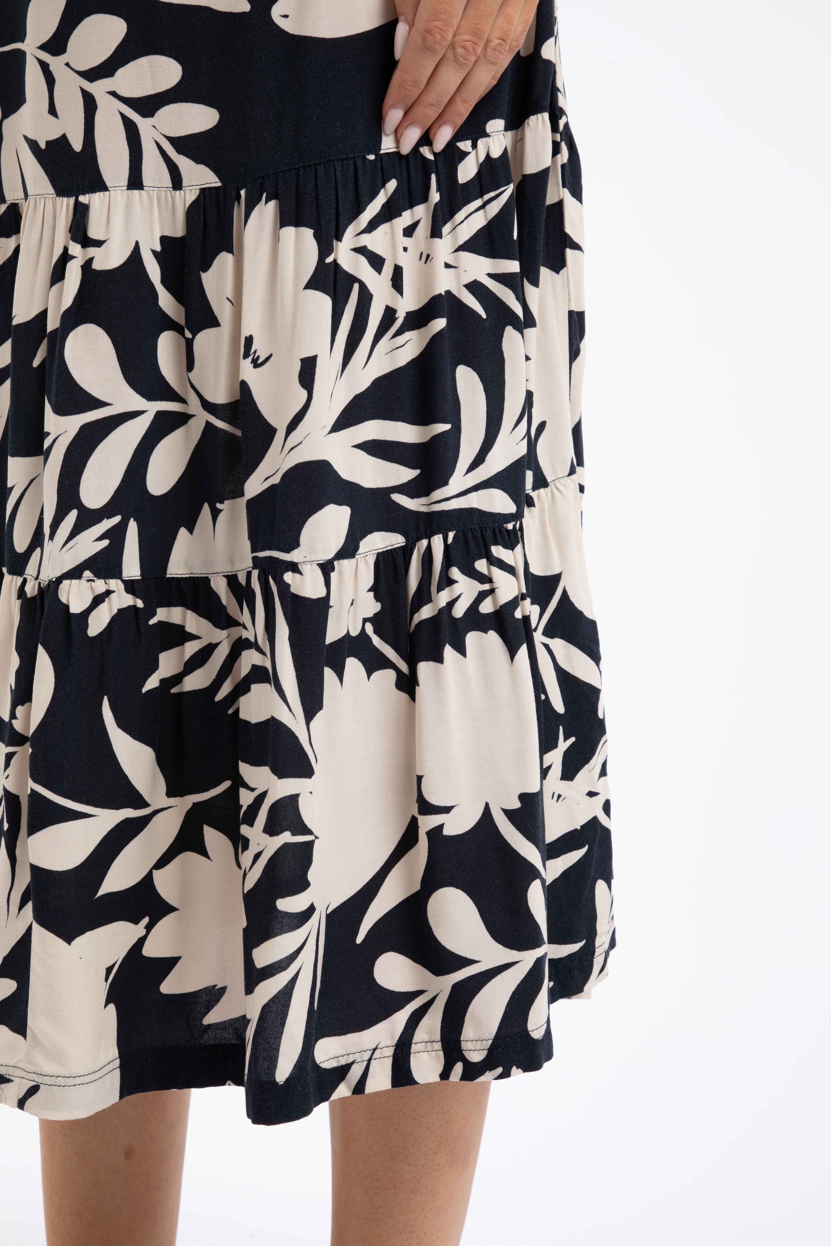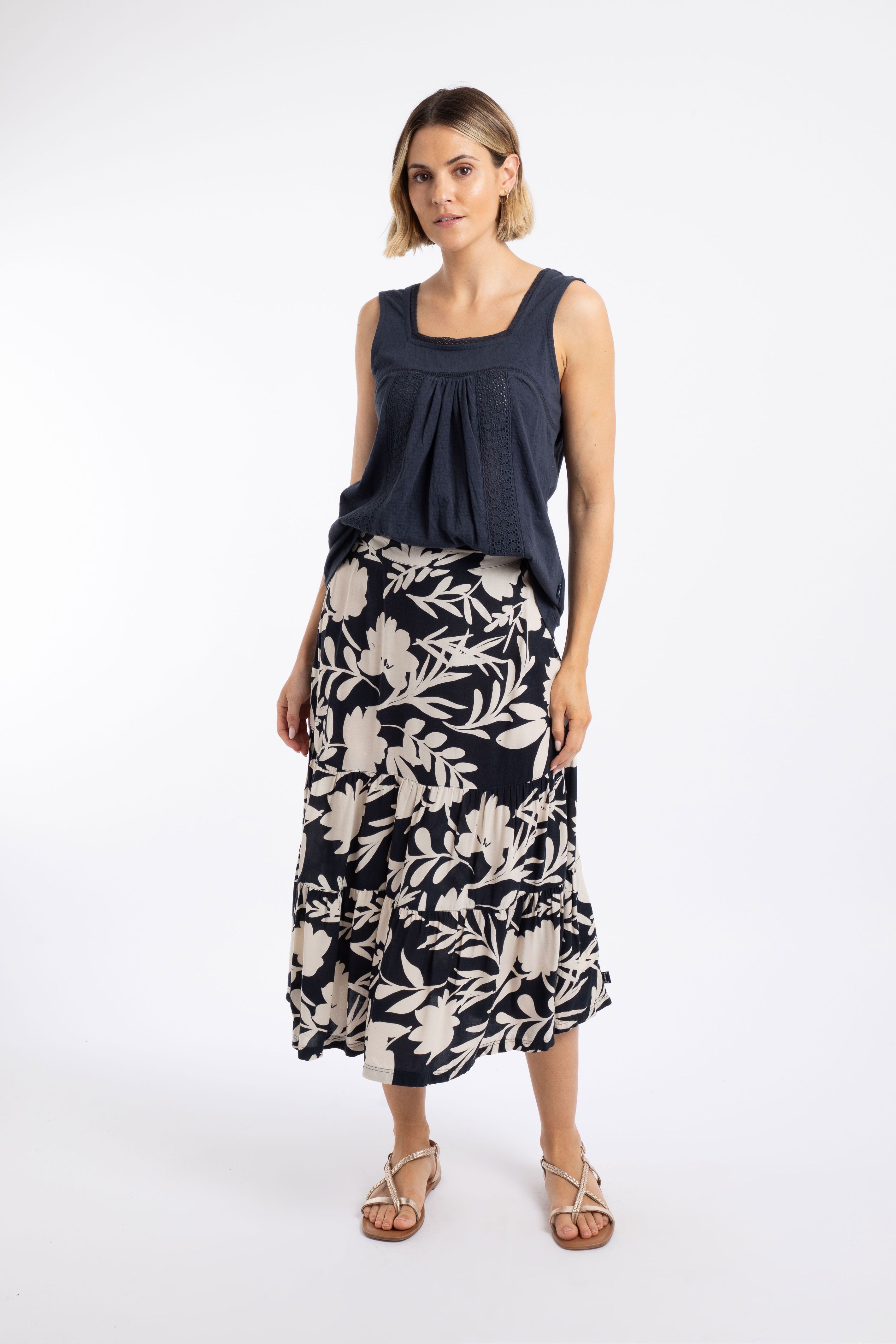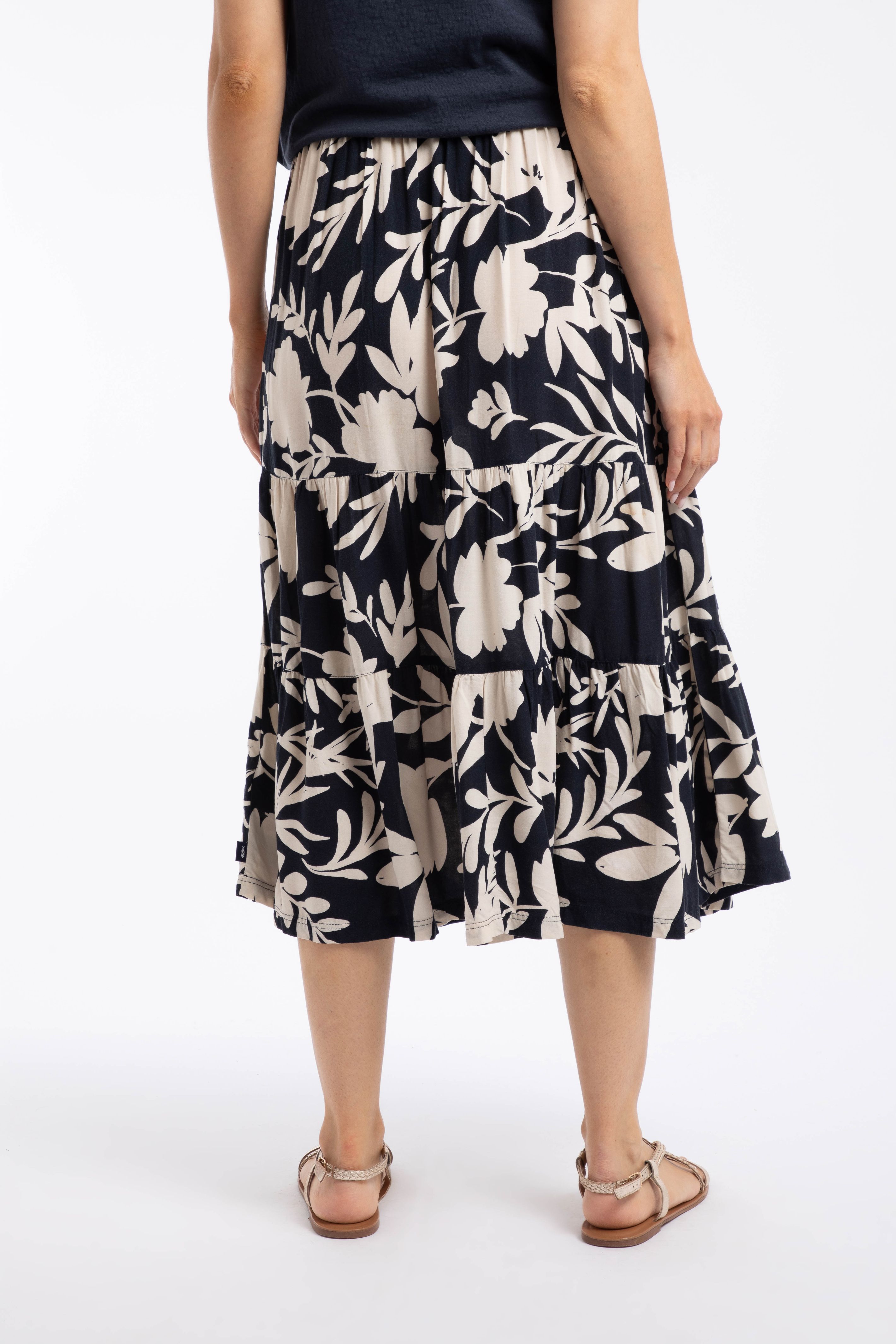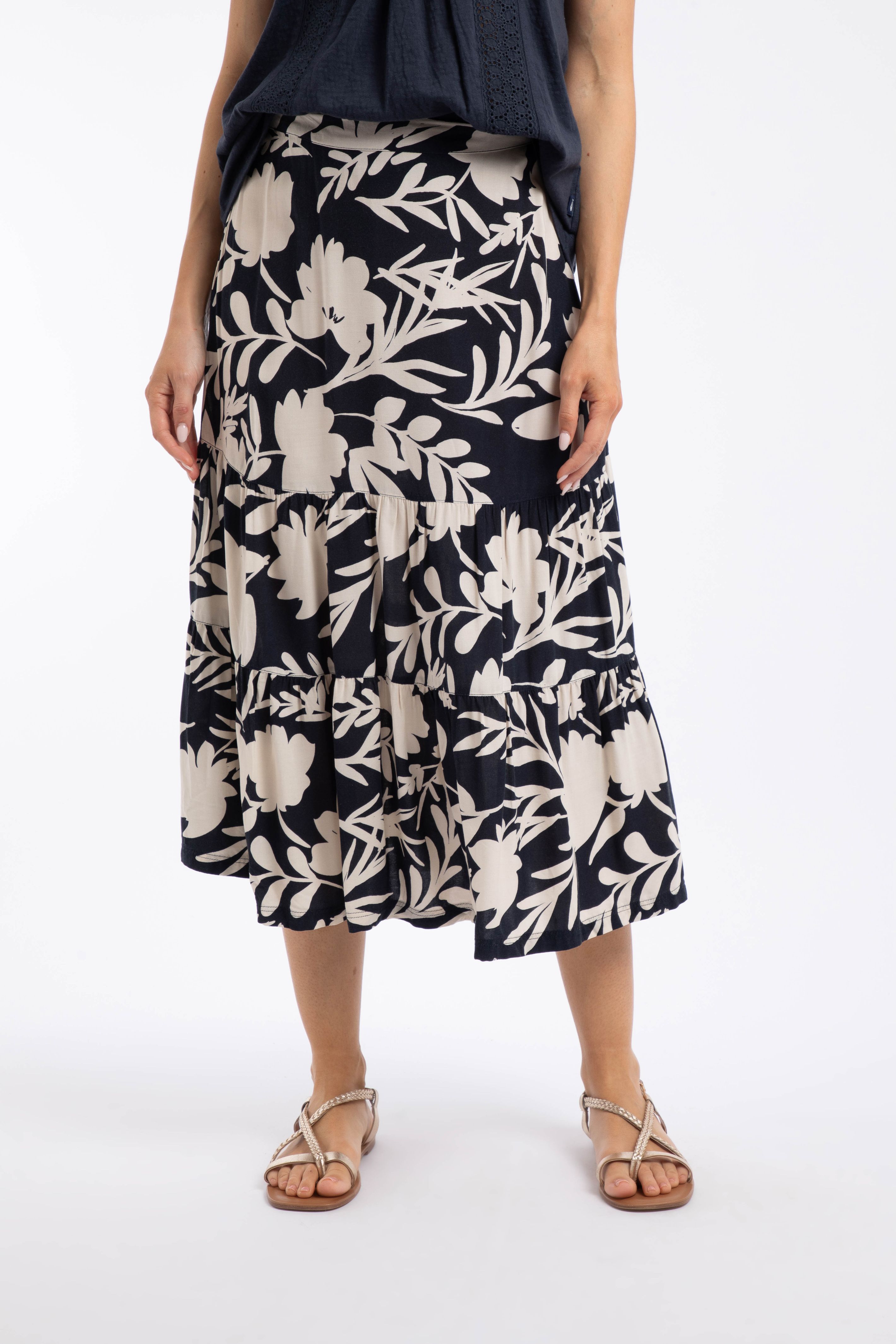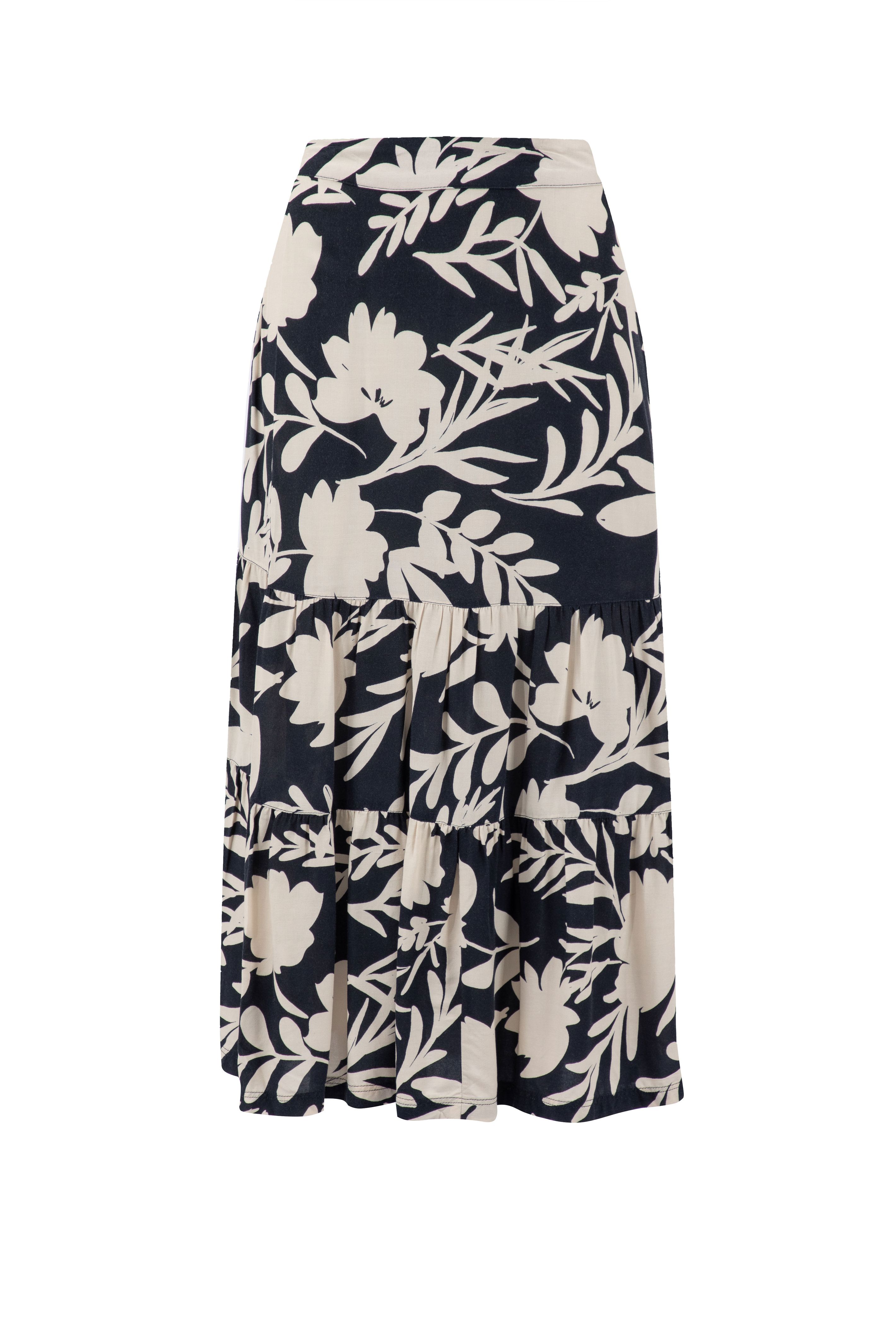 We love the way the Cassis Printed Tiered Skirt moves. Thanks to the fuller bottom, it is great for swishing, should the mood take you. The material is light and comfortable and naturally moisture-wicking, so this skirt is ideal for those hotter days. While it is still cooler, we love to team it with a lightweight knit. It looks equally fantastic with a T-Shirt or vest, and fits beautifully due to the smooth fronted waistband with an elasticated back.