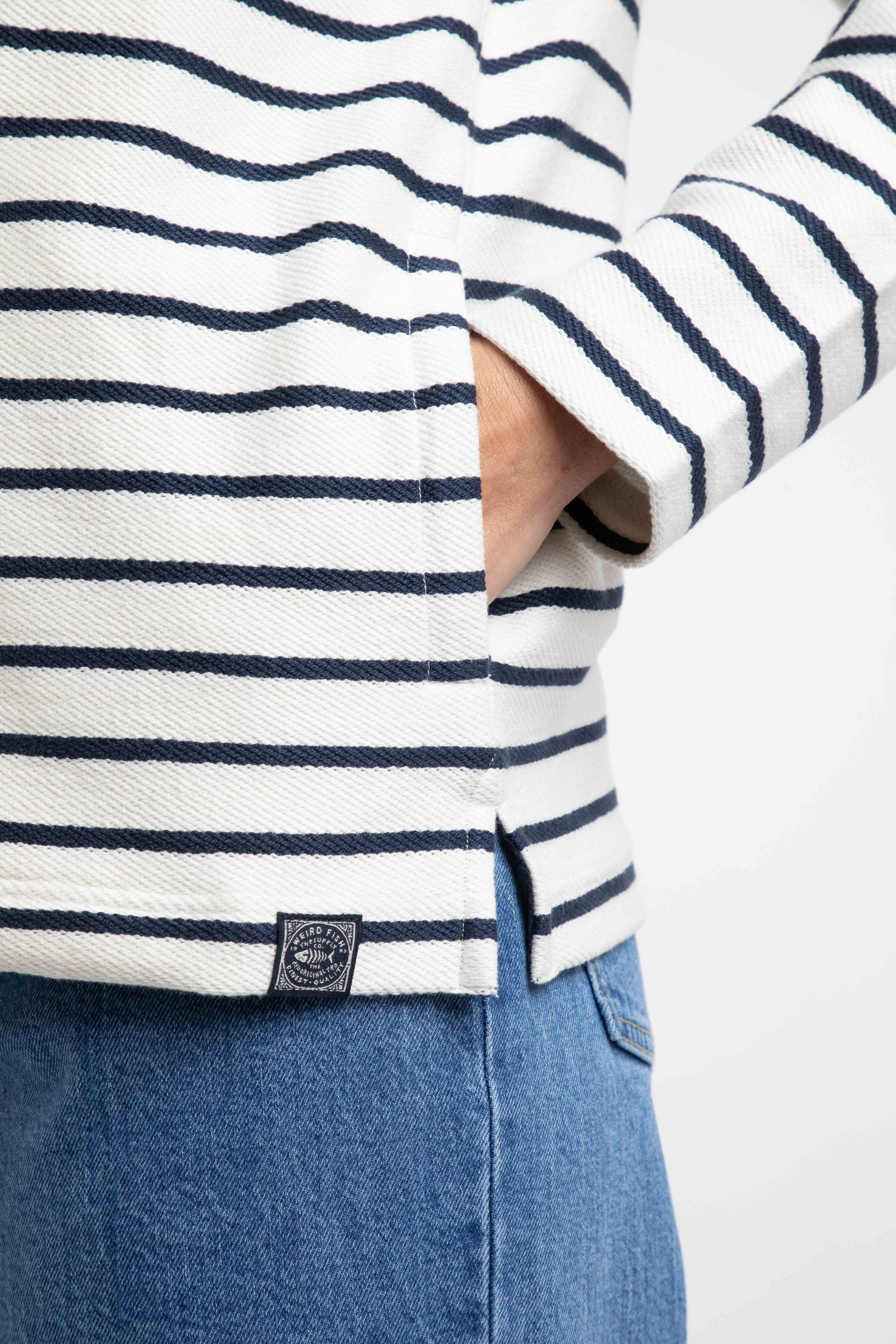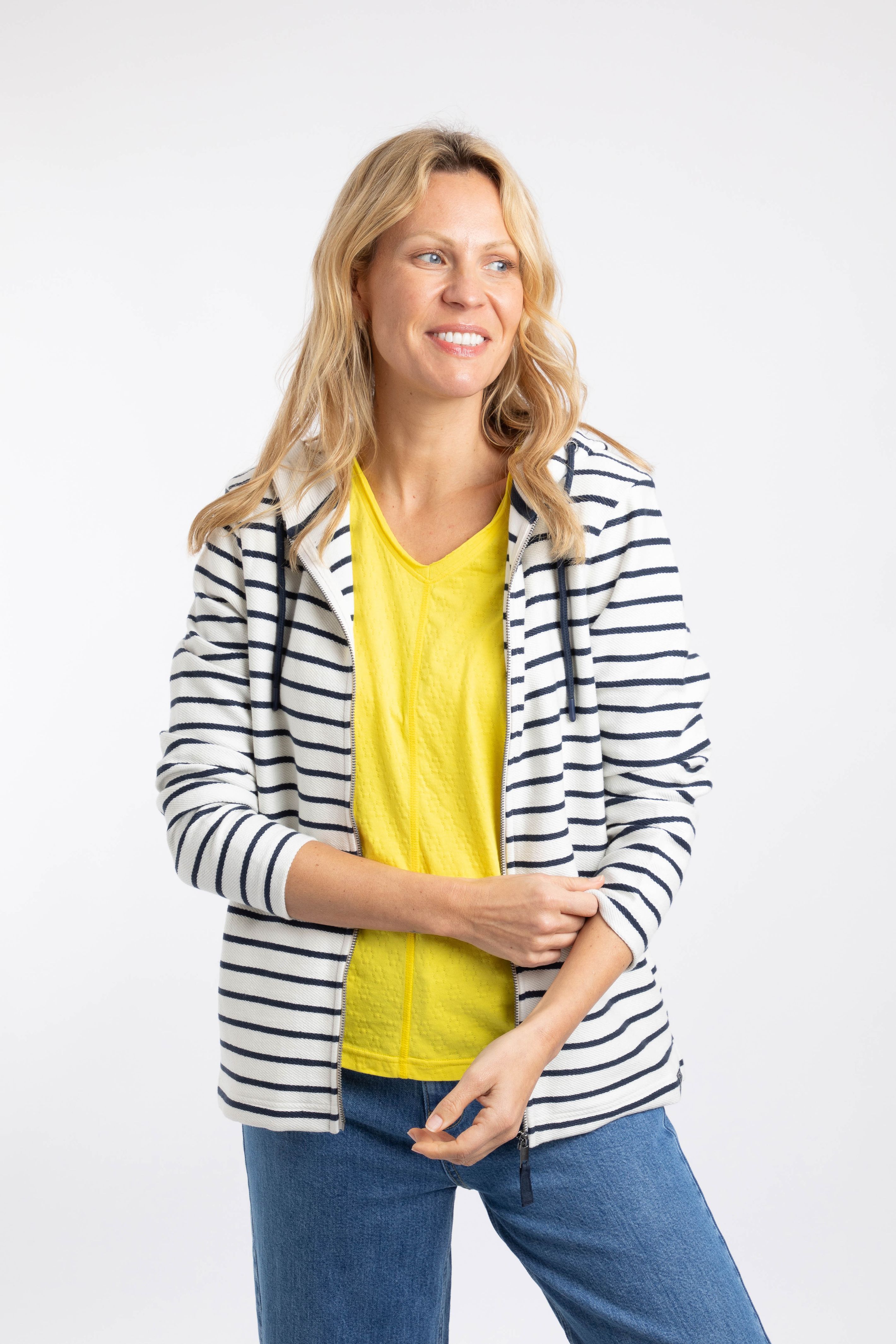 We love the nautical look and feel our the Catalina Striped Full Zip Hoodie. The loopback weave gives a great texture and a casual look. We have added a good sized hood with draw cords, hand slip pockets, and a metal zip with fabric puller.
