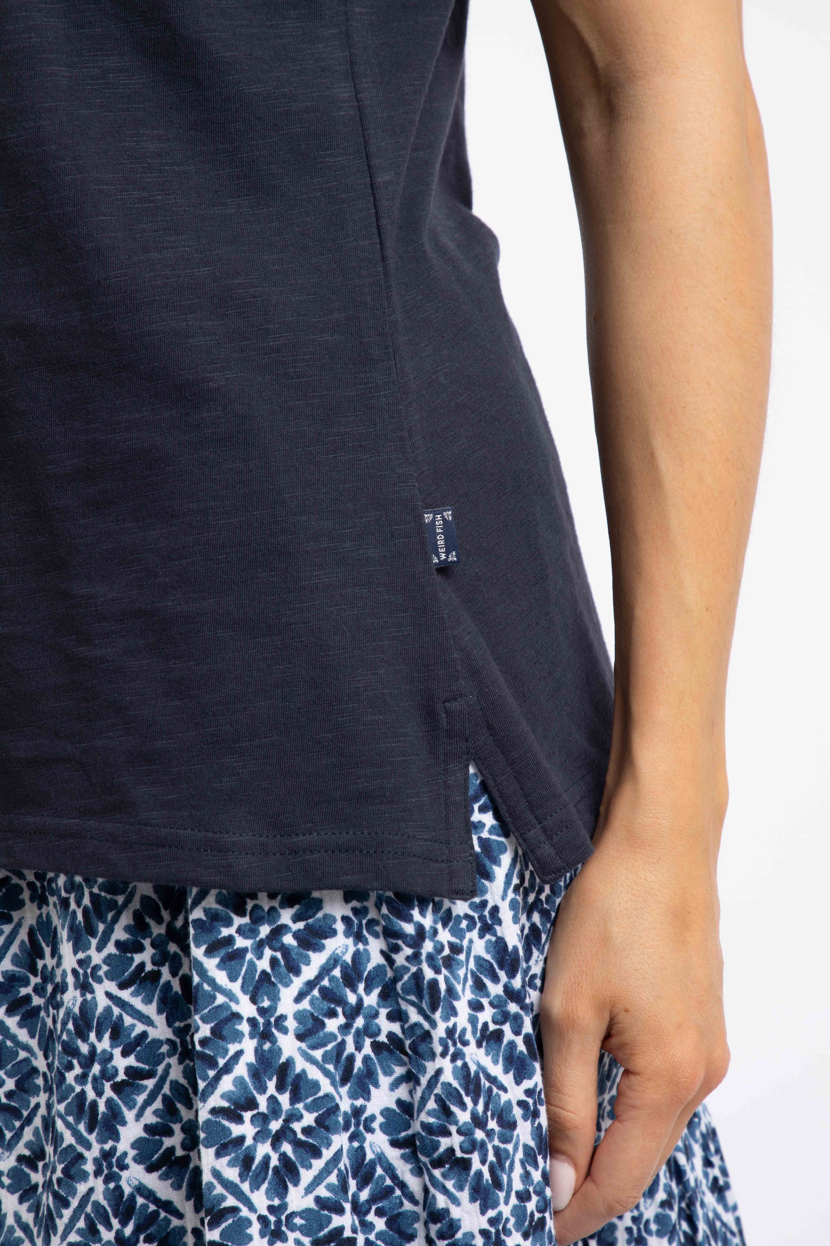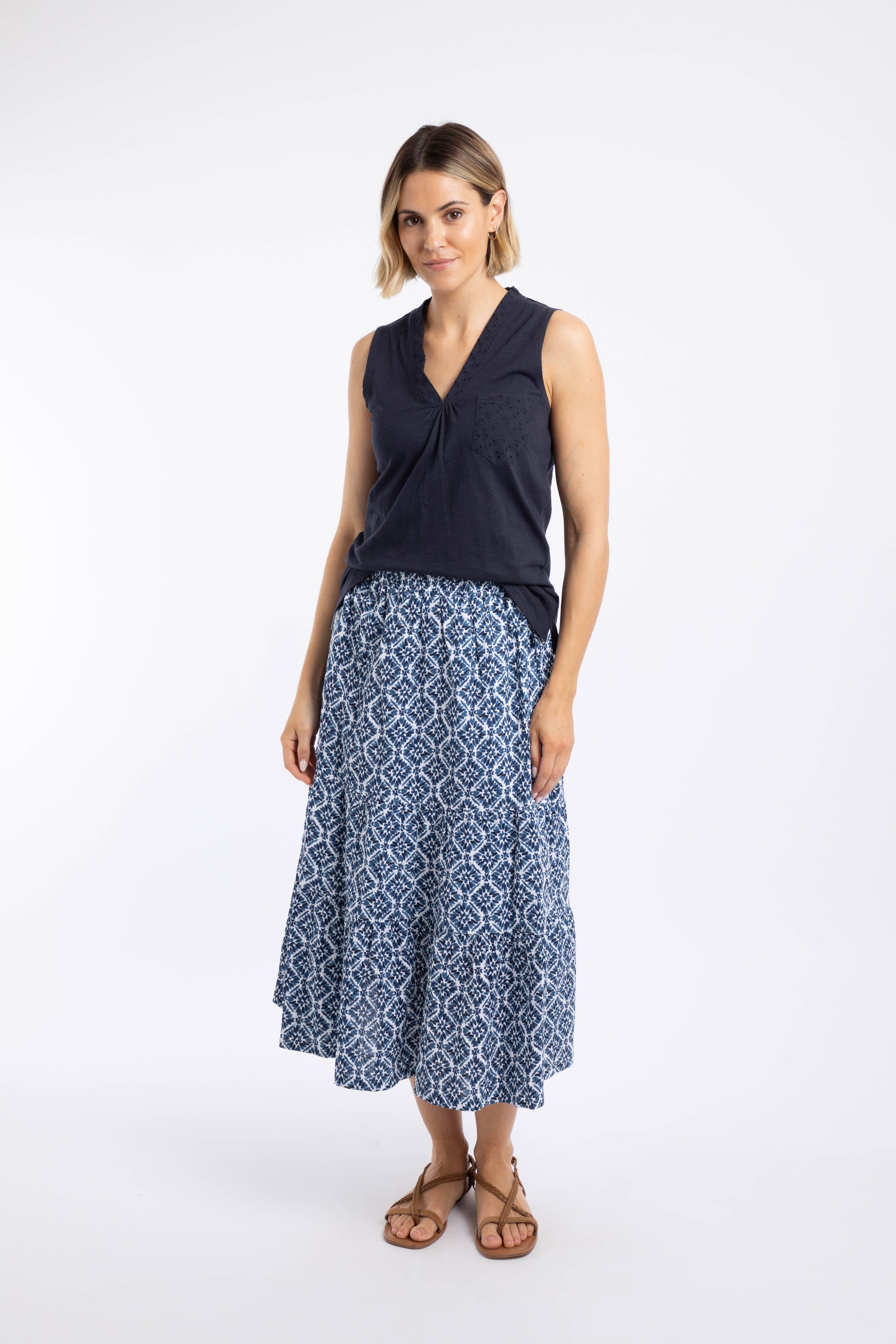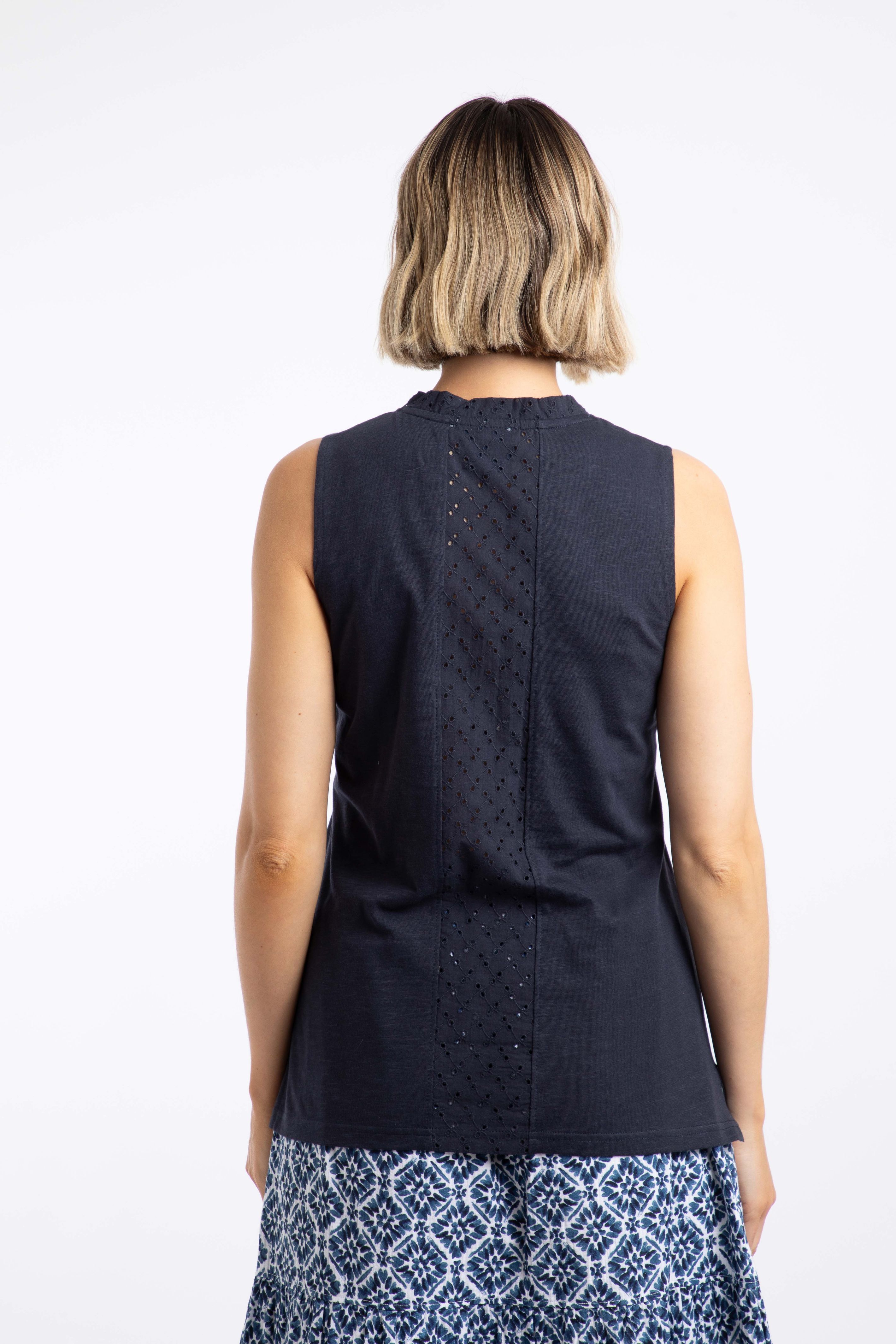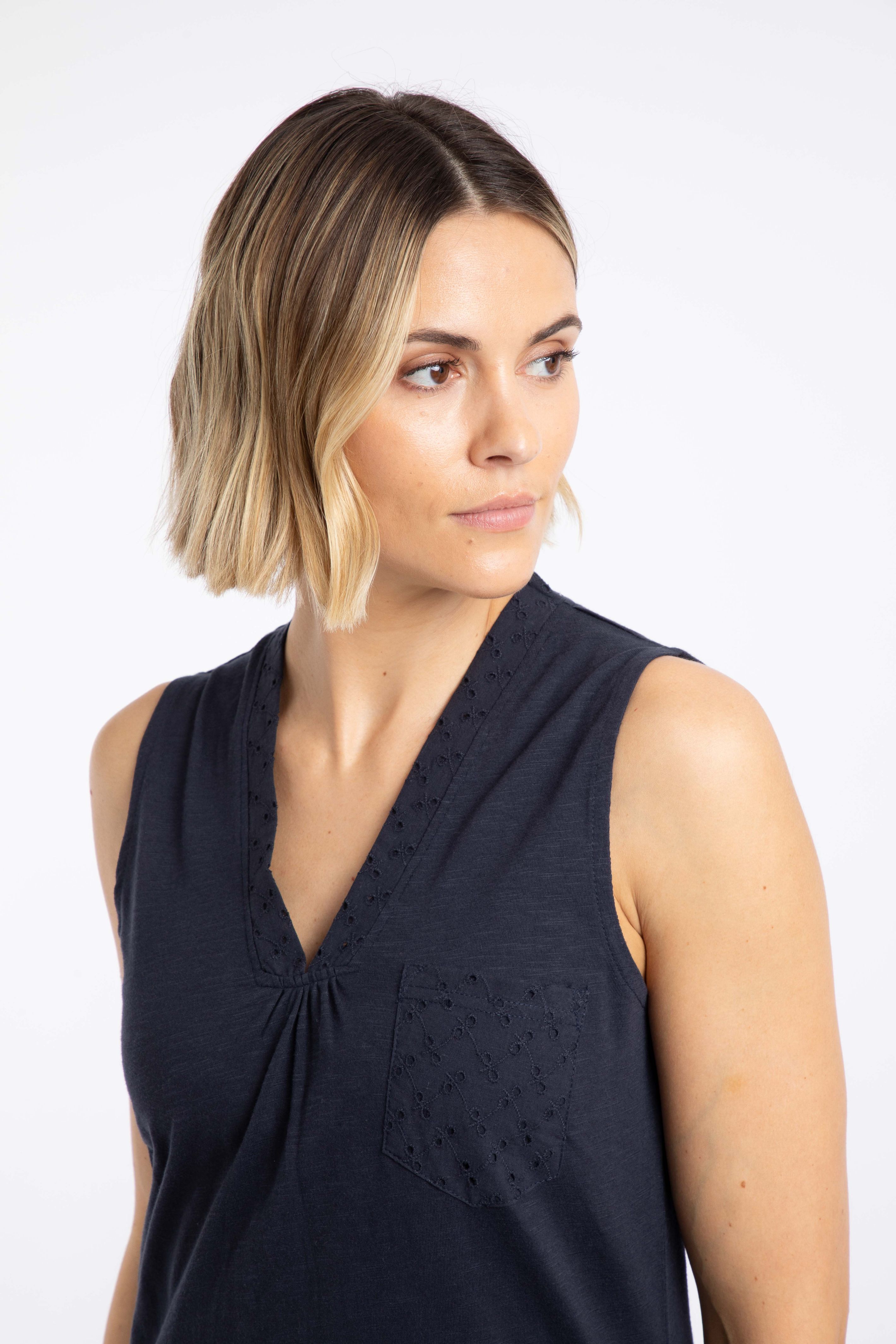Want a top with a little something extra? The Elexis Broidery Pocket Vest is a classic cut V-neck vest, but we have added broidery panels to the back, the neck and to a cute chest pocket. Coming in wearable colours for the season, these block colour tops look great mixed and matched with our range of printed bottoms, or keep it simple with a block colour pair of shorts or trousers.