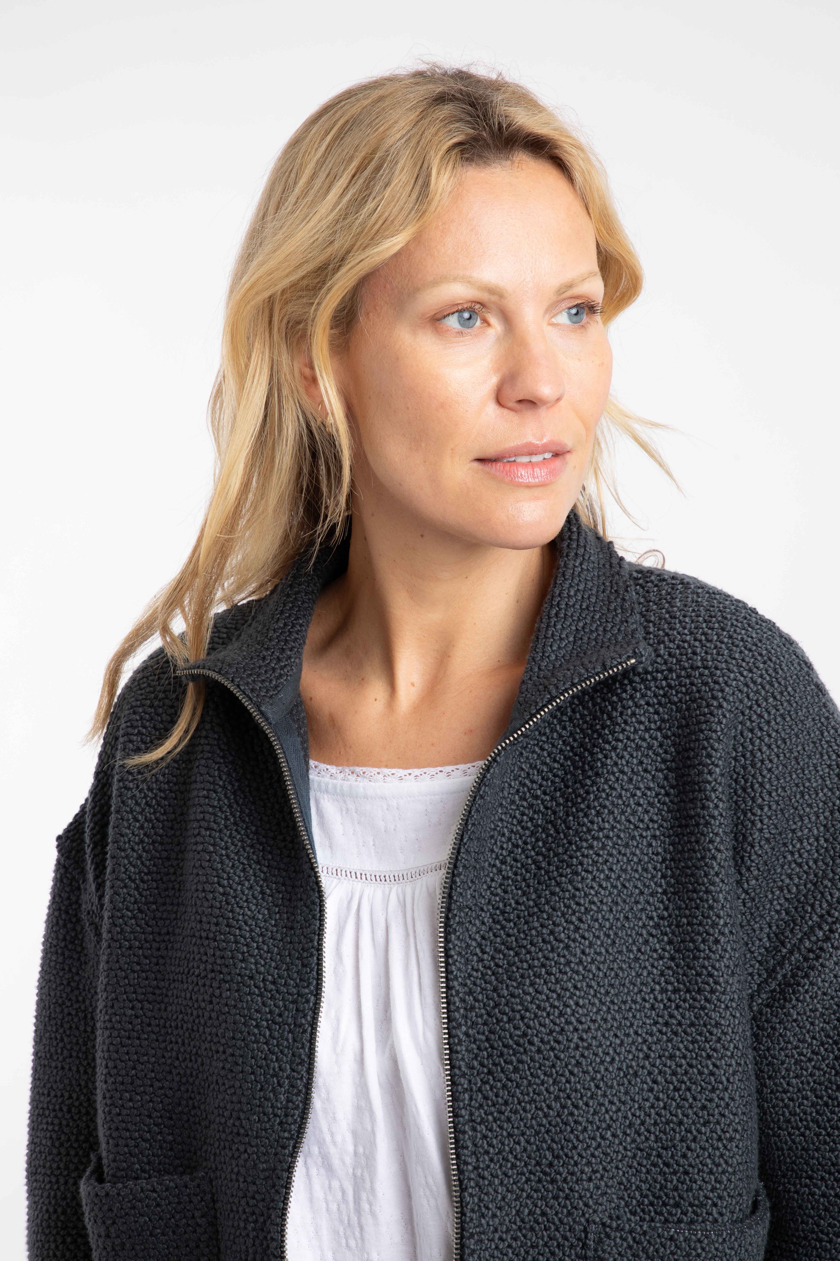 We love innovating and re-inventing ideas with our iconic Macaroni material, and the Emily Full Zip Cropped Macaroni Jacket is a really fun example of this. With a cropped swing shape, 3/4 length sleeves and little front pockets.