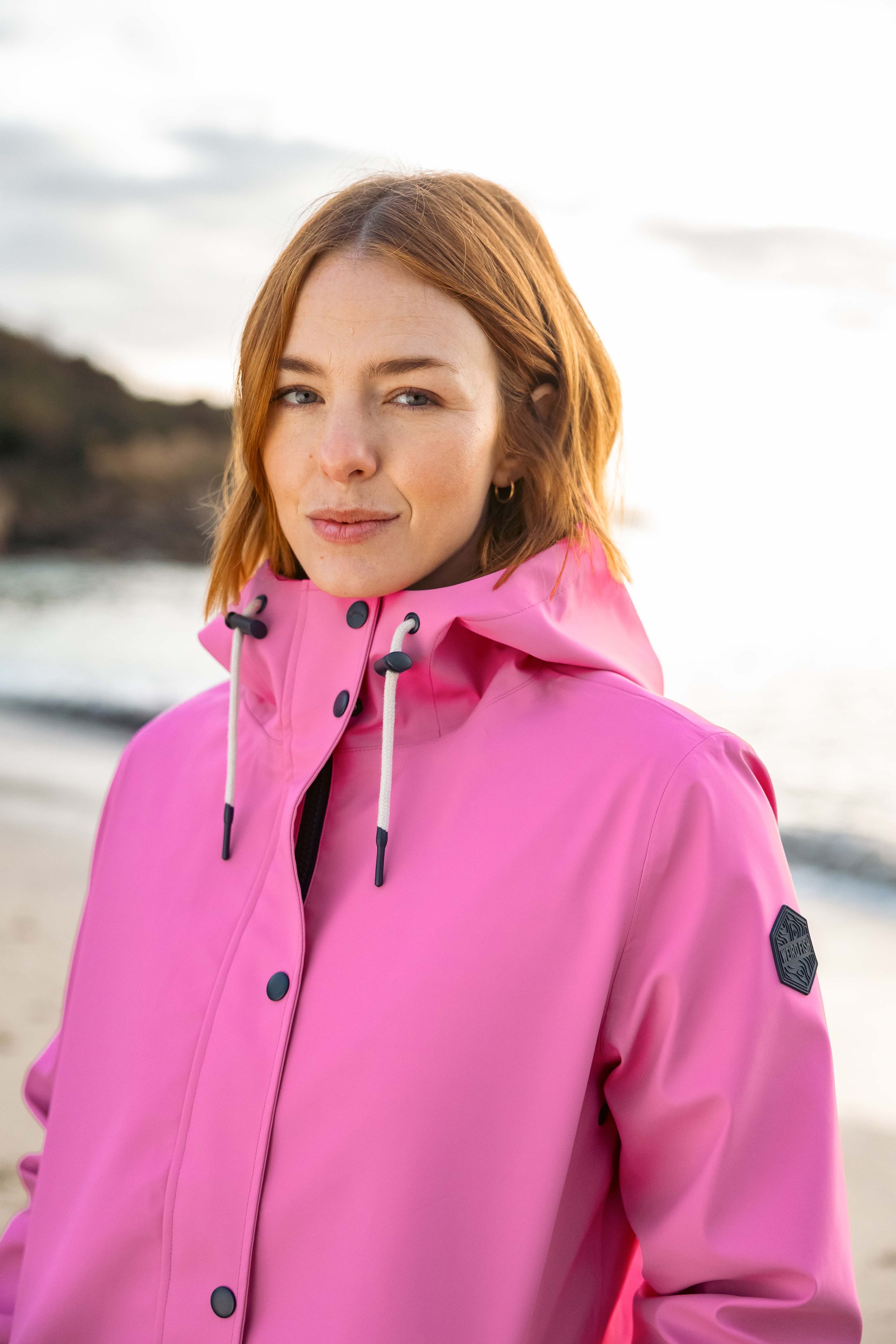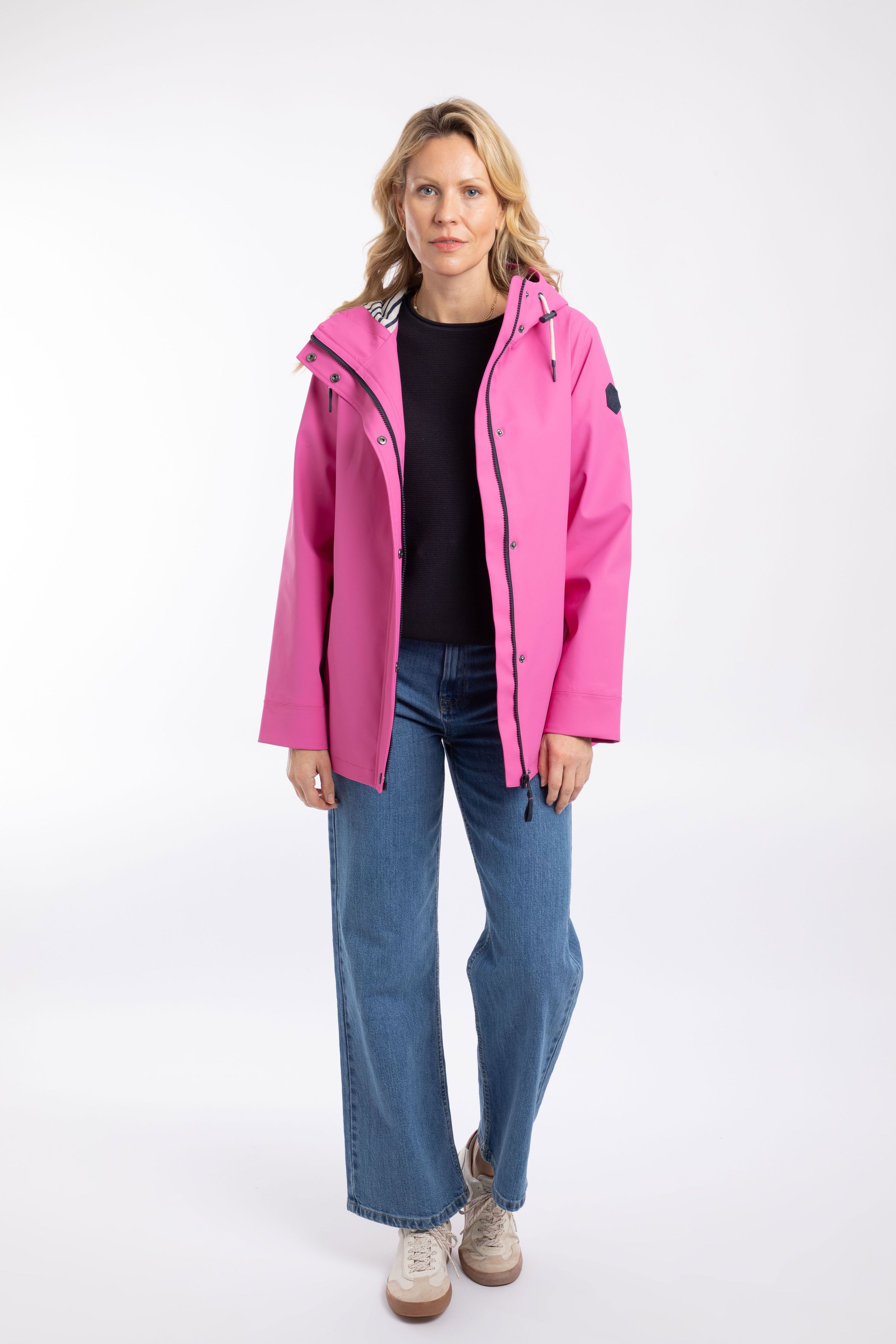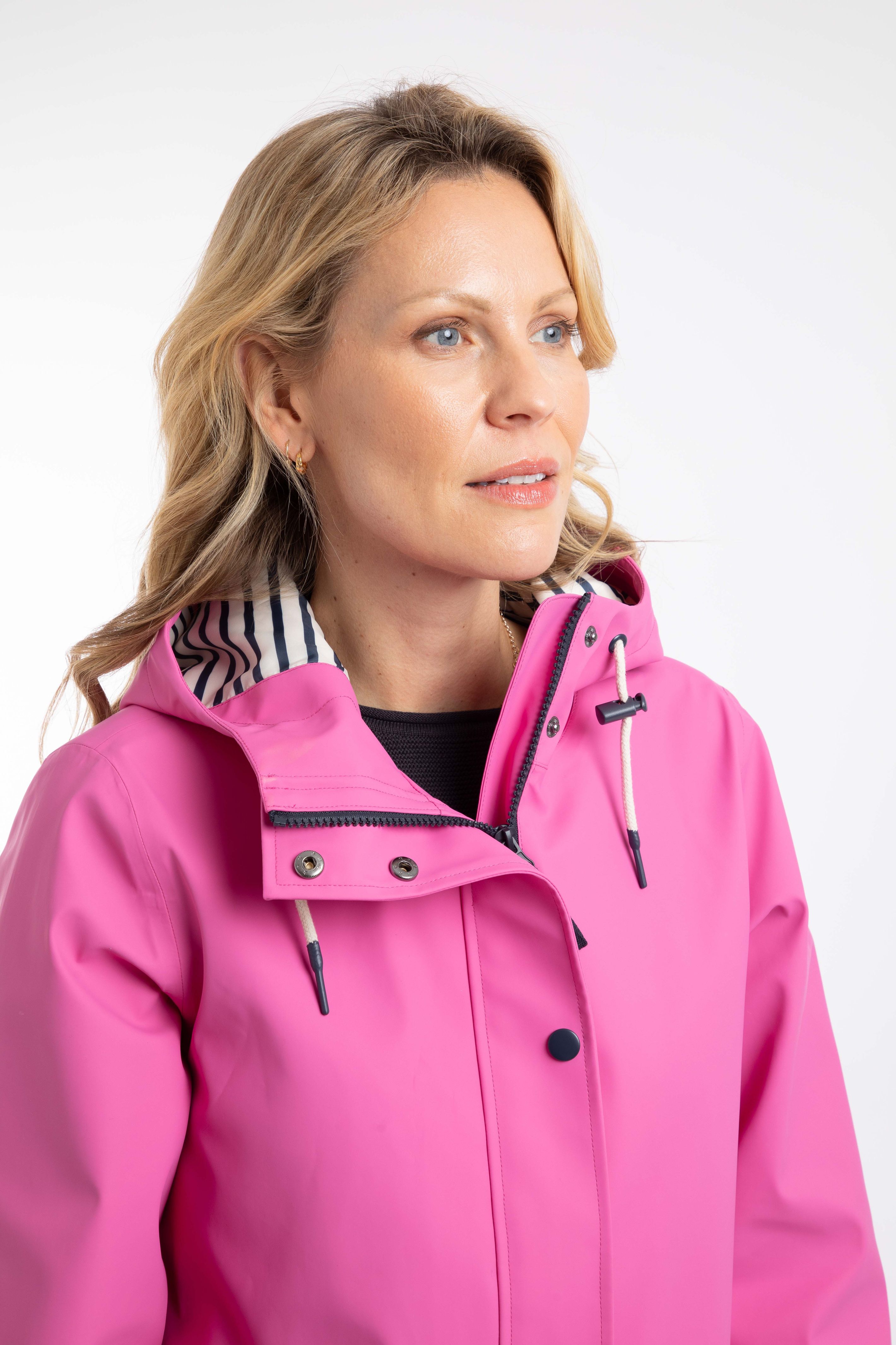 The Faros Waterproof Rain Jacket has an unusual rubber-like feel outer, which helps the rain to roll off and also keeps a great shape. We have added a fun, striped lining and draw cords with toggles to the hood. The popper fastened pockets are angled to help keep the rain out, and we have added a vented back to the shoulders.