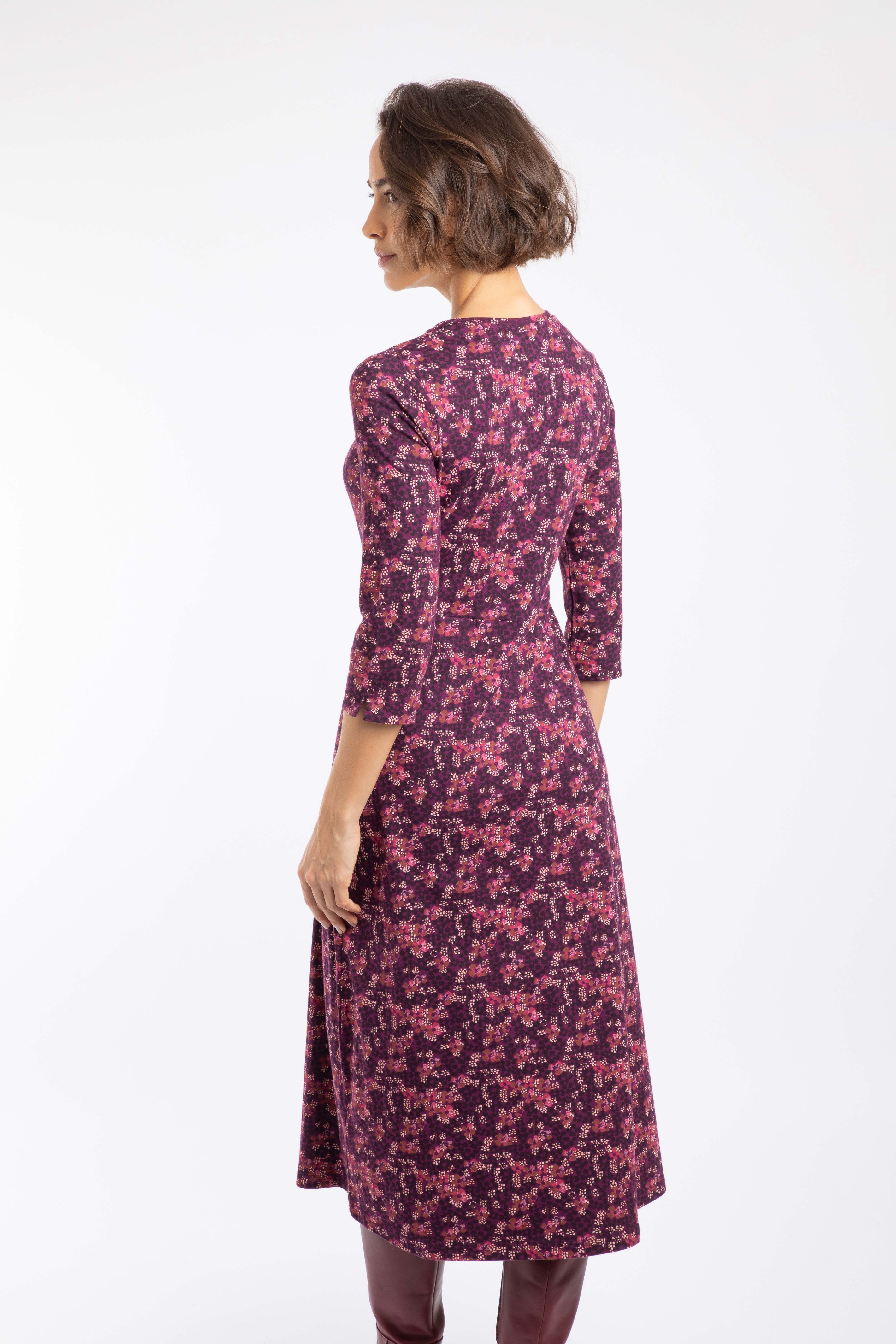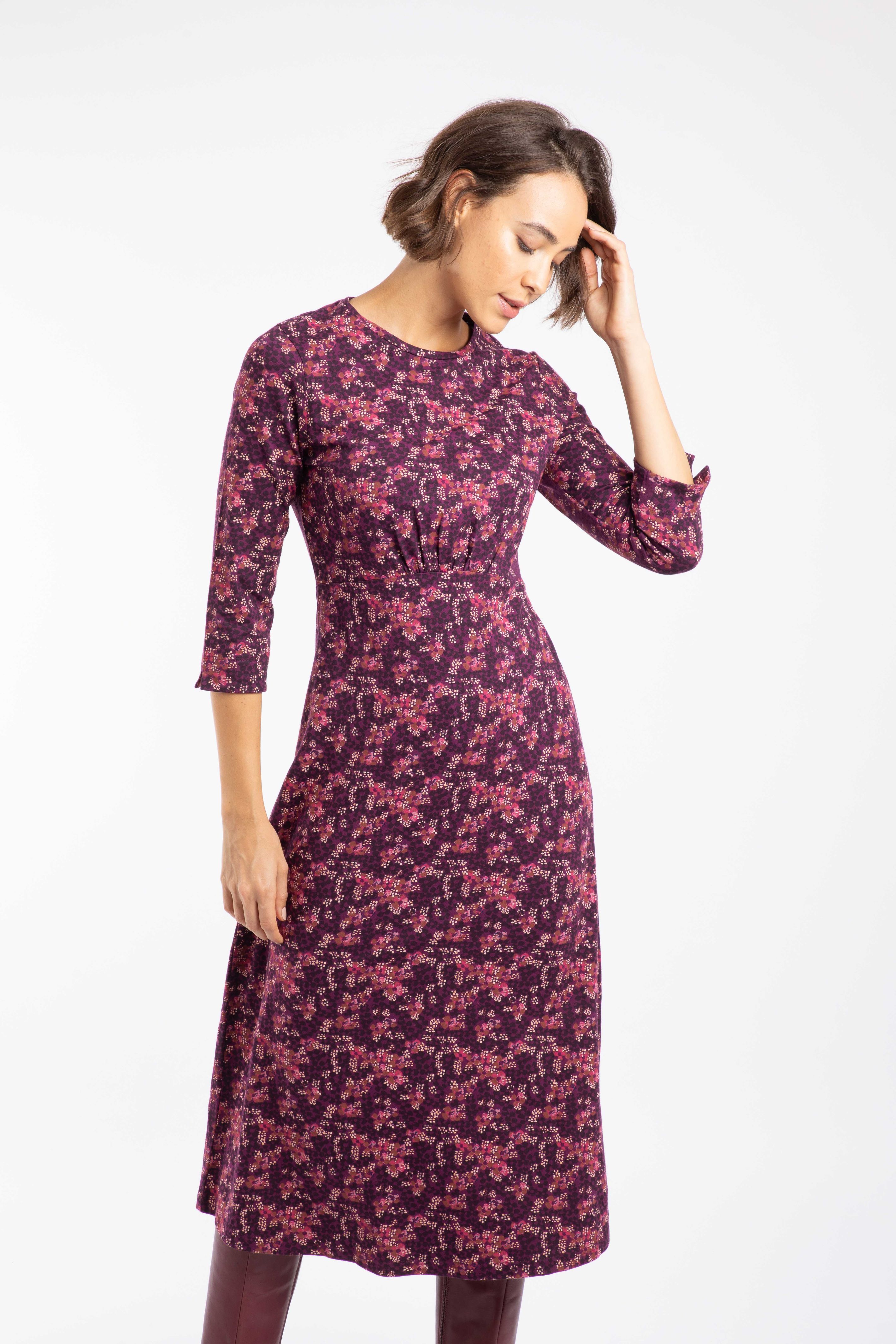The Felicity Printed Jersey Midi Dress has a very flattering fit, thanks to the slightly gathered empire line and crew neck. We have added 3/4 length sleeves, so this works well during those transitional months of the year. The A-line shape and little added elastane give this midi dress a great draped shape, designed to fit all shapes and sizes.