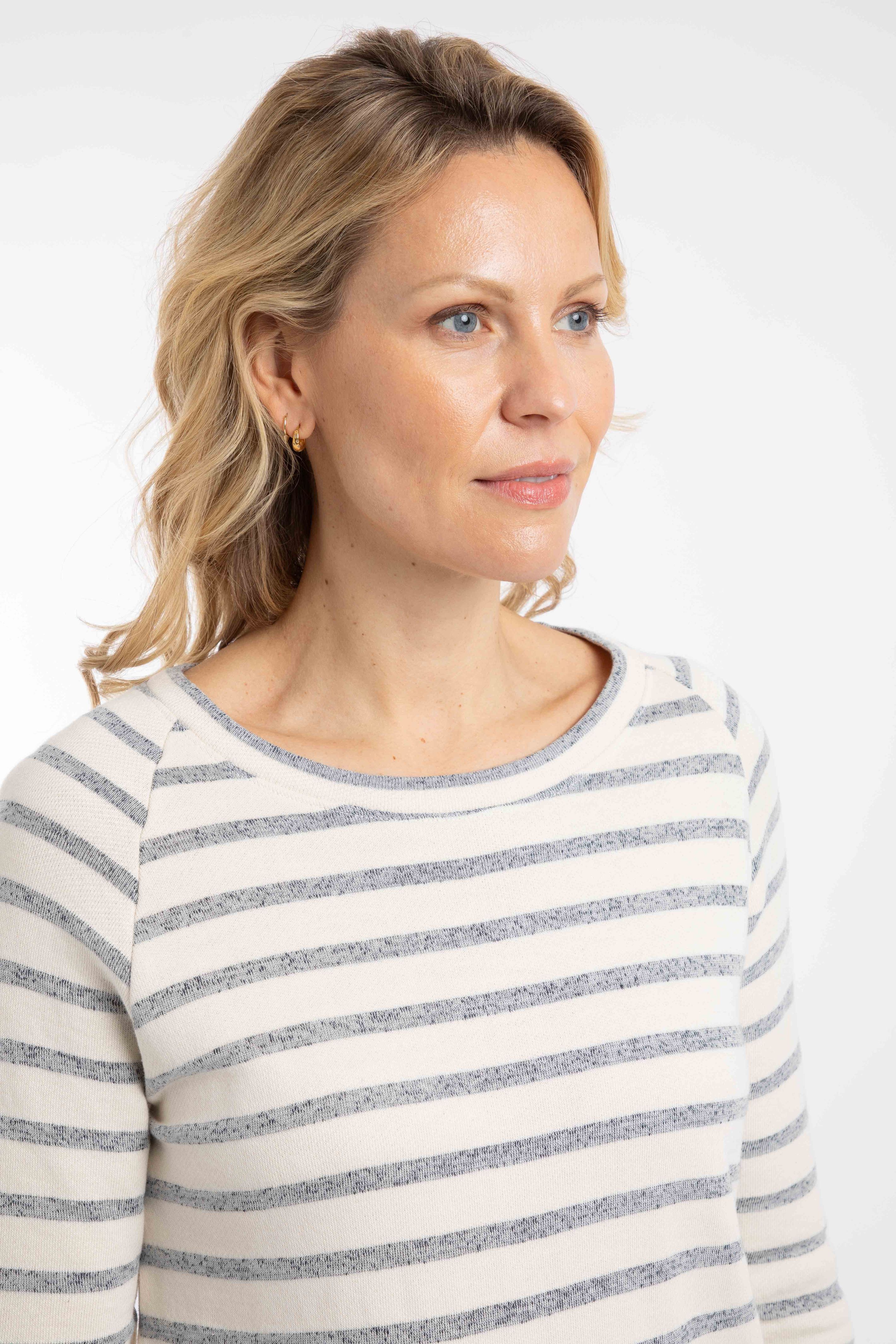 Ideal for transitional weather, the Ives Loopback Stripe Tunic Top is a little heavier than a T-Shirt, but lighter than a jumper. We love the curved, long-line hem with fun, button details on the sides. The woven stripe has a loopback texture on the inside, and we have added a couple of front patch pockets, because everything is better with pockets.