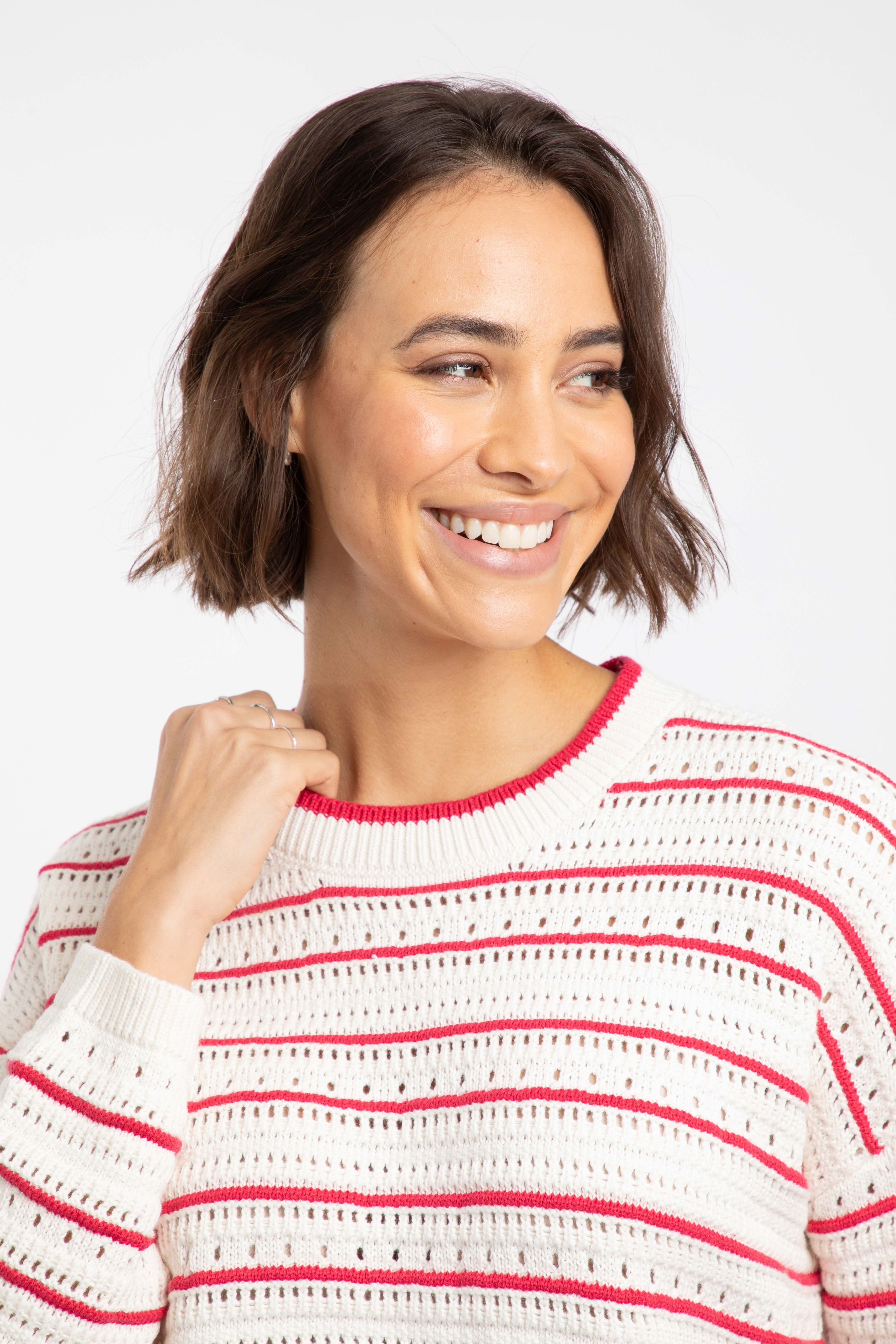 The Liah Pointelle Striped Crew Neck Jumper is a laid-back jumper with a slouchy fit. The open pointelle knit keeps it warm enough for spring, but cool enough for summer. We love the pop of colour.